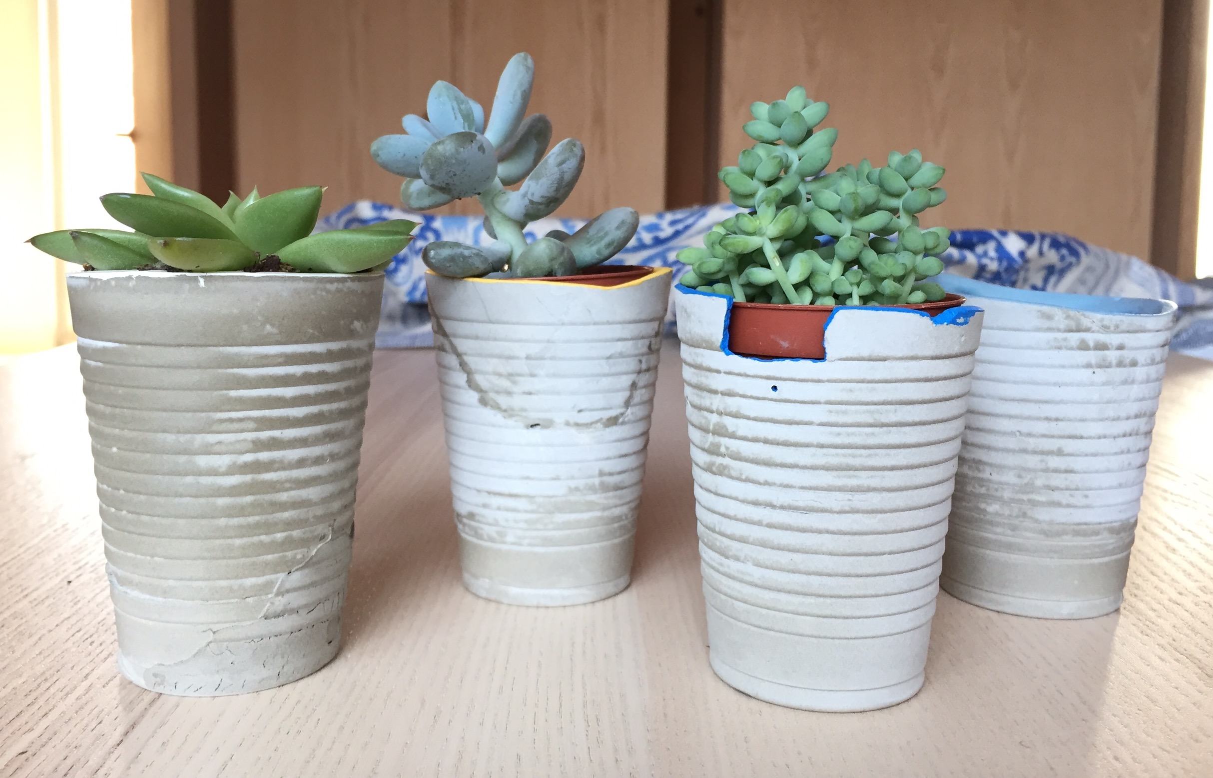 Pequeños maceteros de cemento pintados